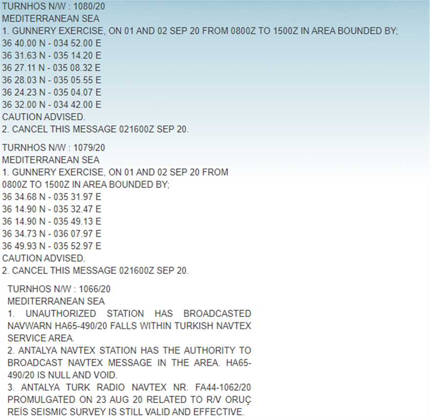Σύμφωνα με πληροφορίες, με τη νέα Navtex θα πραγματοποιηθεί άσκηση με πραγματικά πυρά στην Ανατολική Μεσόγειο από 1 έως 2 Σεπτεμβρίου, ανοιχτά της Μερσίνας στα βόρεια της Κύπρου.