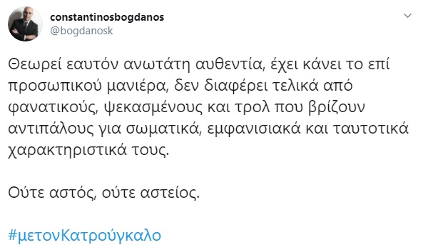 Σε ανάρτησή του στο Twitter, ο βουλευτής της ΝΔ έγραψε: «Θεωρεί εαυτόν ανωτάτη αυθεντία, έχει κάνει το επί προσωπικού μανιέρα, δεν διαφέρει τελικά από φανατικούς, ψεκασμένους και τρολ που βρίζουν αντιπάλους για σωματικά, εμφανισιακά και ταυτοτικά χαρακτηριστικά τους. Ούτε αστός, ούτε αστείος. #μετονΚατρούγκαλο».