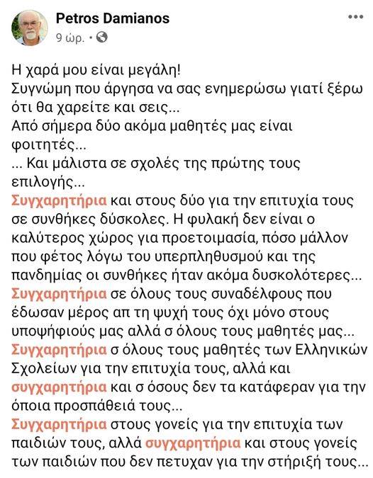Μιλώντας την Κυριακή στον ραδιοφωνικό σταθμό ΘΕΜΑ 104,6, ο κ. Δαμιανός μοιράστηκε τη χαρά του για την επιτυχία των μαθητών του, αναγνωρίζοντας ότι φέτος ήταν μια δύσκολη και διαφορετική χρονιά, εν μέσω της πανδημίας αλλά και του υπερπληθυσμού στις φυλακές. Είναι χαρακτηριστικό ότι από τις 110 θέσεις που υπάρχουν στο κέντρο κράτησης, φέτος υπήρχαν 280.