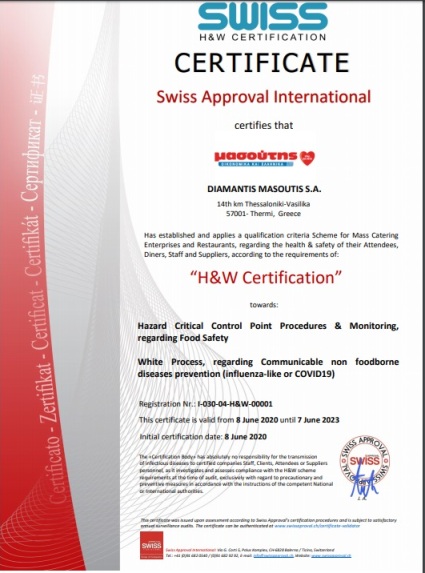 Έτσι η εταιρεία «Μασούτης», μια αμιγώς ελληνική οικογενειακή εταιρία, μέσω της συμμόρφωσής της με το πρότυπο «H&W CERT», πιστοποιείται και επίσημα τόσο για την ασφάλεια και την ποιότητα των τροφίμων που διαθέτει στους καταναλωτές όσο και για την προφύλαξη από τον Covid-19 αλλά και από άλλες ιογενείς λοιμώξεις, που μεταδίδονται με παρόμοιο τρόπο, όπως η γρίπη και η πνευμονία.