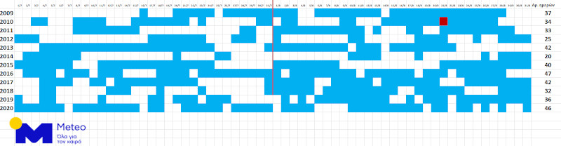 Ο πίνακας που ακολουθεί δίνει τις ημέρες με ισχυρό μελτέμι στο Αιγαίο (γαλάζια κελιά) από το 2009 έως και τον Αύγουστο του 2020.