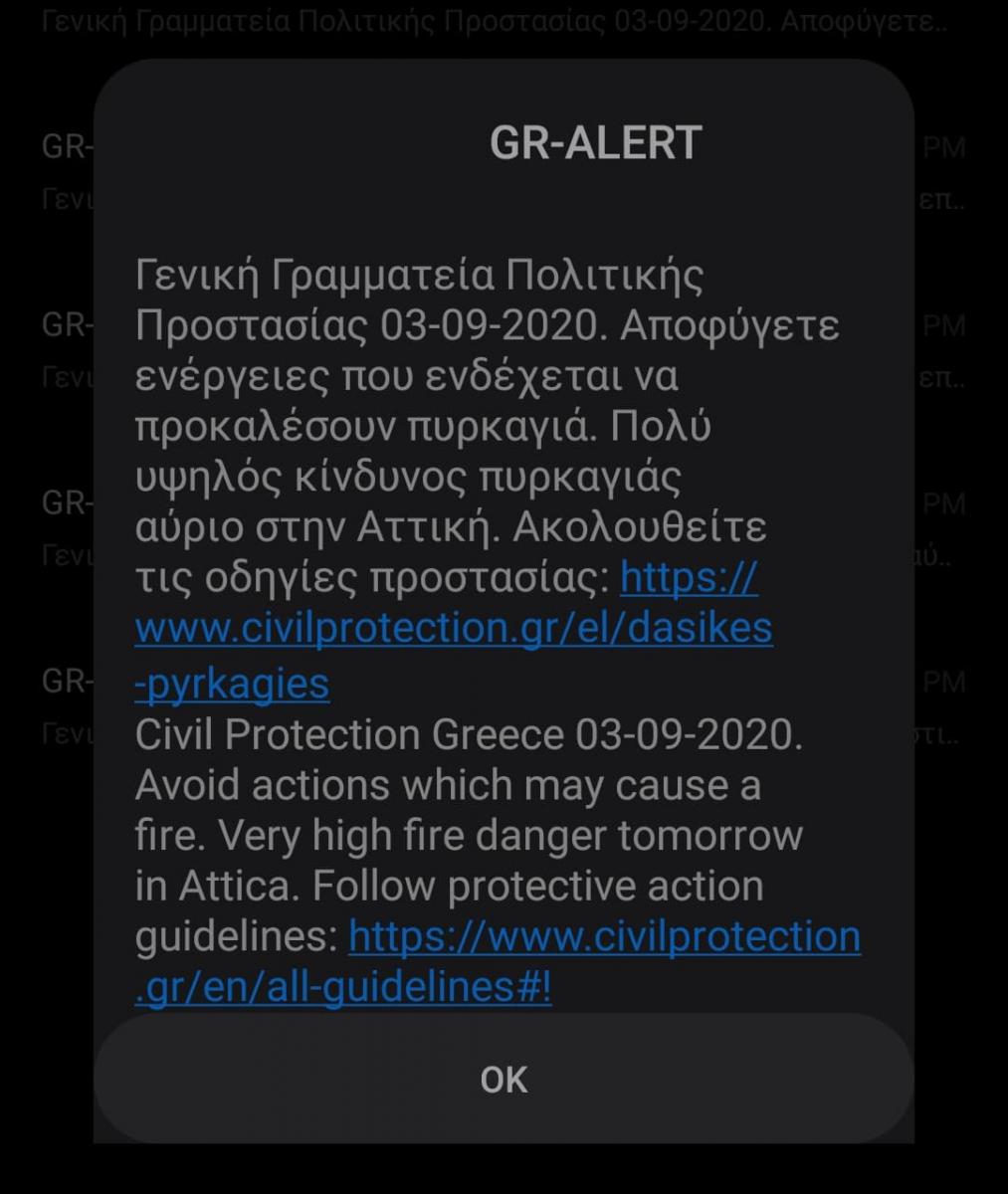 Αιτία; Ο αυξημένος κίνδυνος πυρκαγιάς που προβλέπεται για την Παρασκευή στην Αττική, όπως φαίνεται και από το μήνυμα.
