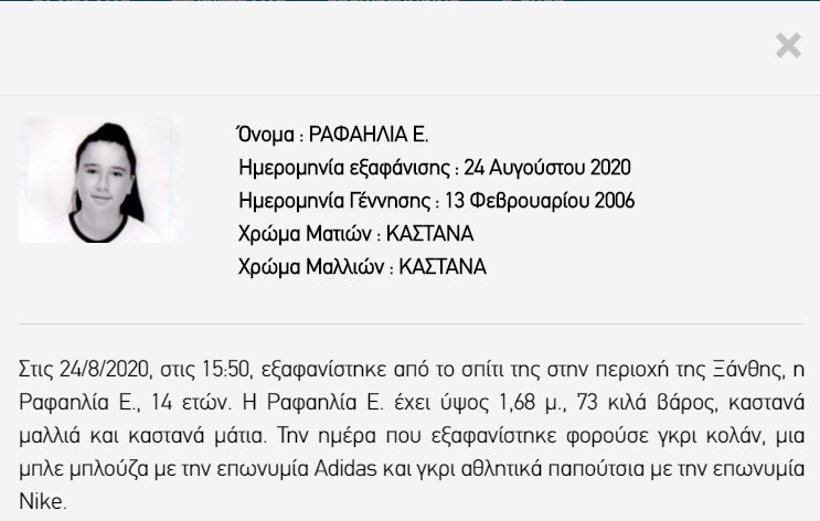 Όπως ανακοίνωσε το Χαμόγελο του Παιδιού, στις 24/8/2020, στις 15:50, εξαφανίστηκε από το σπίτι της στην περιοχή της Ξάνθης, η Ραφαηλία Ε., 14 ετών.