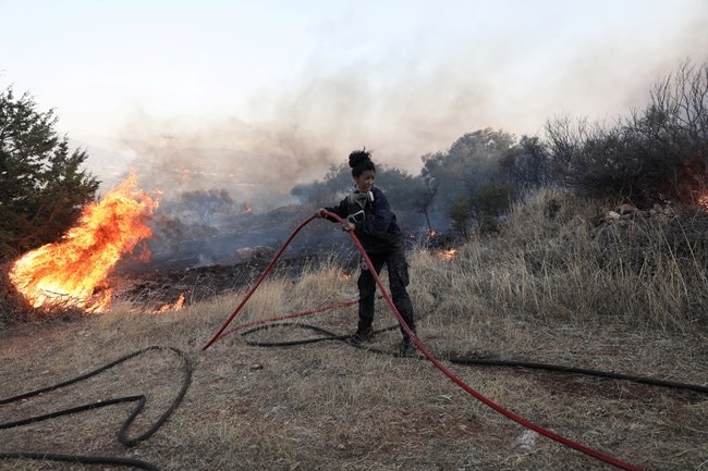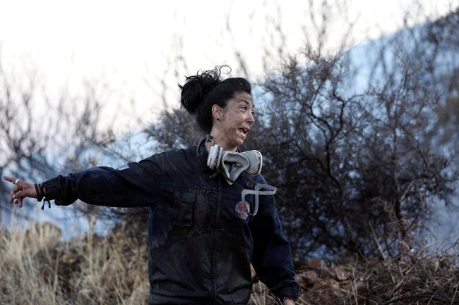 Ο φωτογραφικός φακός του Reuters, αποτύπωσε το πρόσωπο μίας γυναίκας πυροσβέστη, στη φωτιά που ξέσπασε στην Ανάβυσσο, η οποία παλεύει με τις φλόγες, με σθένος και δύναμη ψυχής, ενώ το πρόσωπό της έχει κυριολεκτικά μαυρίσει από τους καπνούς.