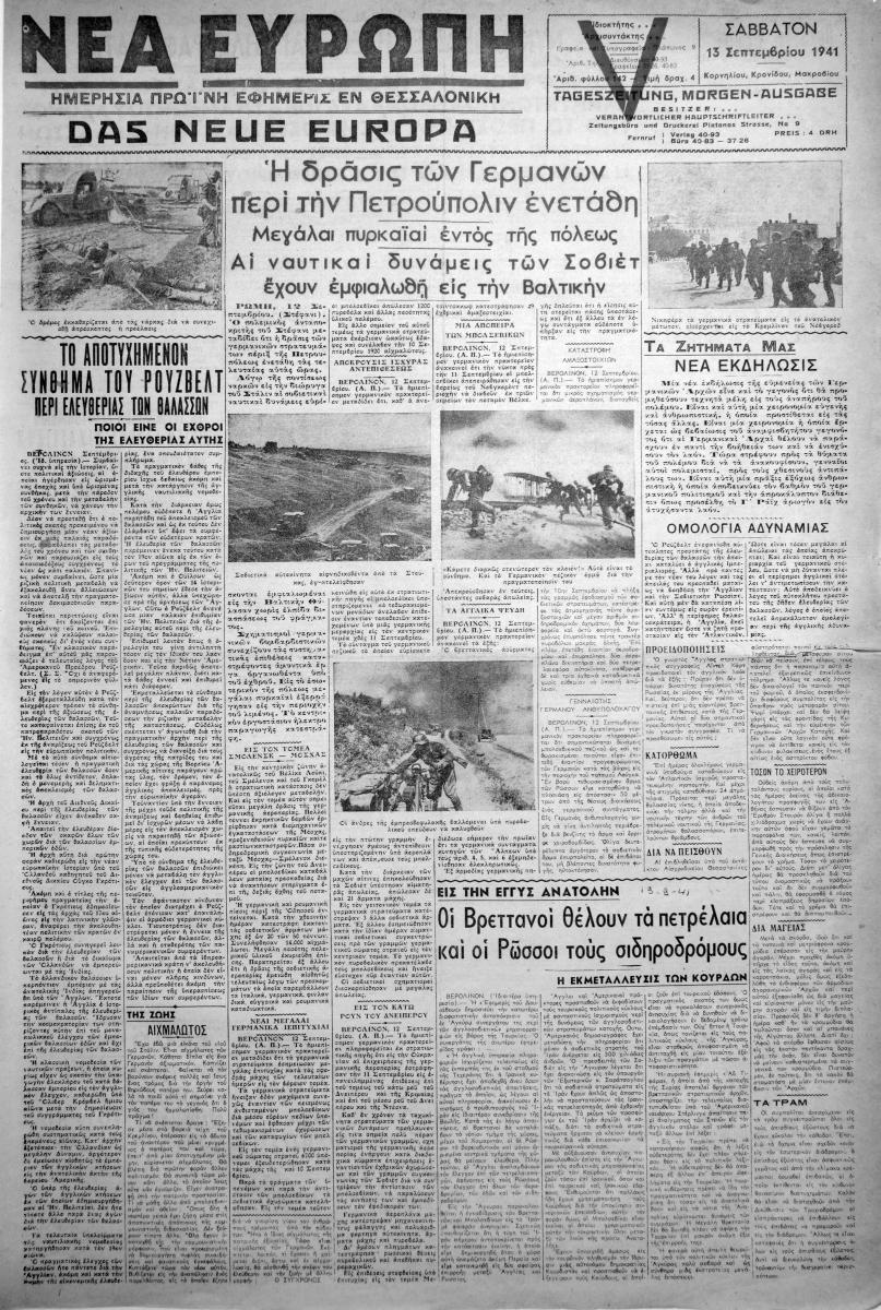 Σταμάτησε έτσι να καταγράφεται ο σφυγμός της ζωής στη Θεσσαλονίκη και με πηχυαίους τίτλους καταγραφόταν μέρα με τη μέρα η «θριαμβευτική» πορεία των δυνάμεων του Άξονα με φωτογραφίες του Φύρερ σε διάφορες συναντήσεις του από τον Μουσολίνι (1/9/1941) μέχρι την παρασημοφόρηση σε «ανδραγαθ’ησαντας αξιωματικούς και στρατιωτικούς»(6/9/1941). Το πρώτο, το κύριο θέμα της εφημερίδας «Νέα Ευρώπη» ήταν σχεδόν καθημερινά μία ανακοίνωση του Γενικού Αρχηγείου των Γερμανικών Ενόπλων Δυνάμεων. Στην εν λόγω εφημερίδα έγραφαν ελάχιστοι δημοσιογράφοι από θεσσαλονικιώτικες εφημερίδες που έκλεισαν, οι οποίοι αργότερα πέρασαν από δοσιλογικά δικαστήρια.