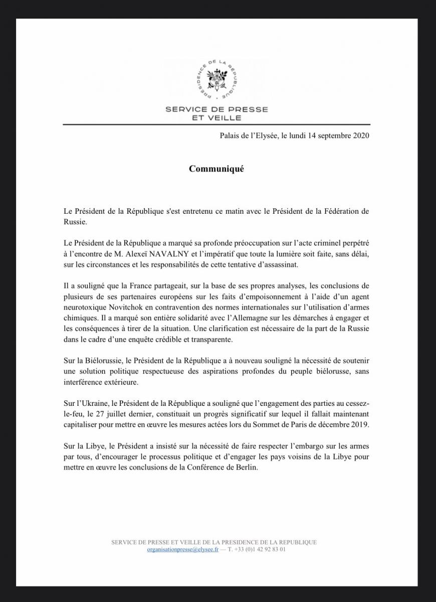 Σε ανακοίνωσή το προεδρικό μέγαρο αναφέρει ότι η Γαλλία διαθέτει στοιχεία ότι πρόκειται για δηλητηρίαση, με την βοήθεια του νευροτοξικού Novitchok, γεγονός που «αντιτίθεται στις διεθνείς νόρμες για χρήση χημικών όπλων». Σύμφωνα με το Ελυζέ ο Εμανουέλ Μακρόν δεν δίστασε να χαρακτηρίσει την υπόθεση Ναβάλνι ως «απόπειρα δολοφονίας», μιλώντας στον Πούτιν.