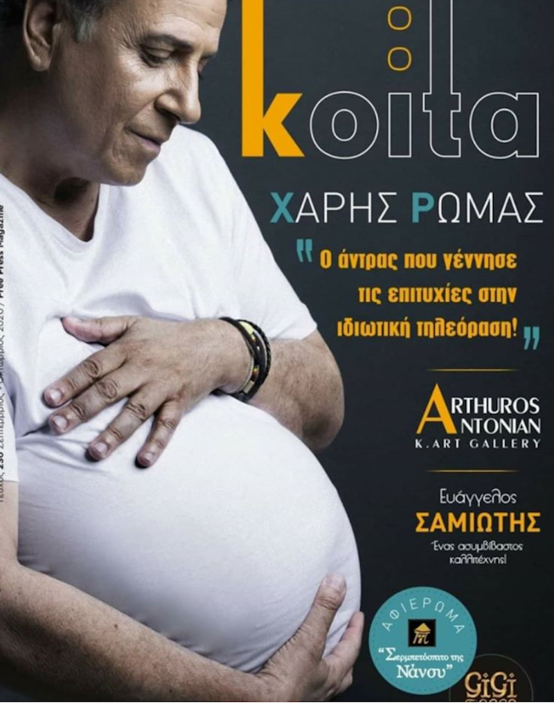 Οπως αναφέρει το SigmaLive, η φωτογράφηση έγινε για το εξώφυλλο του περιοδικού Koita Magazine και βλέπουμε τον Χάρη Ρώμα, να αγκαλιάζει τρυφερά τη φουσκωμένη του κοιλιά, ενώ το εξώφυλλο συνοδεύει ο τίτλος: «Ο άντρας που γέννησε τις επιτυχίες στην ιδιωτική τηλεόραση».