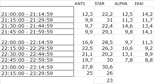 Σύμφωνα με τα μη καθαρά ποσοστά τηλεθέασης , στο δυναμικό κοινό έκανε 22,2% κι έφτασε μέχρι 27,8% καταφερνοντας έτσι να κάνει μια ικανοποιητική πρεμιέρα αν αναλογιστεί κανείς τόσο τον ανταγωνισμό όσο και την χαμηλή πάσα που έλαβε.