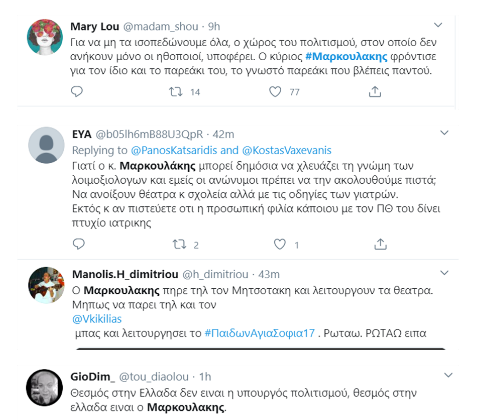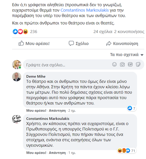 «Εάν ό,τι γράφεται αληθεύει (προσωπικά δεν το γνωρίζω), ευχαριστούμε θερμά τον Constantinos Markoulakis για την παρέμβαση του υπέρ του θεάτρου και των ανθρώπων του. Και οι πρώτοι άνθρωποι του θεάτρου είναι οι θεατές» σχολίασε ο κ. Χωμενίδης, αναφερόμενος στις πληροφορίες που ήθελαν τον κ. Μαρκουλάκη να επικοινωνεί με το Μέγαρο Μαξίμου για το θέμα