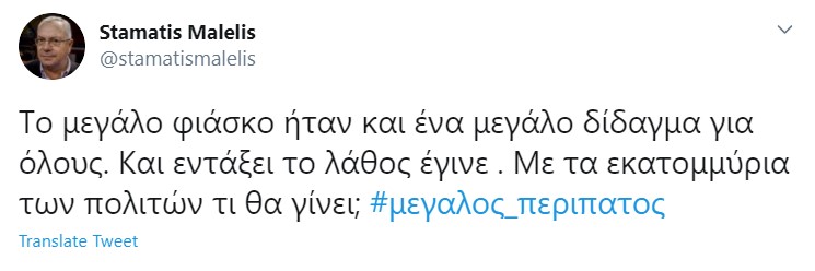Ο Στ. Μαλέλης λοιπόν σημειώνει με νόημα: «Το μεγάλο φιάσκο ήταν και ένα μεγάλο δίδαγμα για όλους. Και εντάξει το λάθος έγινε . Με τα εκατομμύρια των πολιτών τι θα γίνει; #μεγαλος_περιπατος».