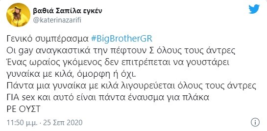 Μάλιστα επανήλθε και σε δεύτερη ανάρτηση έγραψε: «Γενικό συμπέρασμα #BigBrotherGR. Οι gay αναγκαστικά την πέφτουν σε όλους τους άντρες. Ένας ωραίος γκόμενος δεν επιτρέπεται να γουστάρει γυναίκα με κιλά, όμορφη ή όχι. Πάντα μια γυναίκα με κιλά λιγουρεύεται όλους τους άντρες για sex και αυτό είναι πάντα έναυσμα για πλάκα. ΡΕ ΟΥΣΤ».
