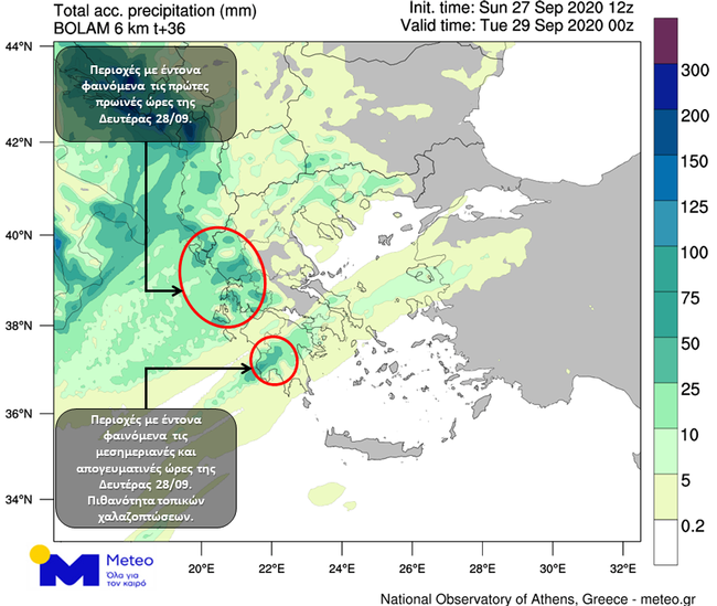 Σε ισχύ βρίσκεται το νέο έκτακτο δελτίο επιδείνωσης του καιρού που εξέδωσε η Εθνική Μετεωρολογική Υπηρεσία, σύμφωνα με το οποίο απο σήμερα μέχρι και την Τρίτη προβλέπονται ισχυρές βροχές και καταιγίδες που θα επηρεάσουν αρχικά τα νησιά του Ιονίου, την Ήπειρο, τη δυτική Στερεά, τη δυτική και βαθμιαία την υπόλοιπη Πελοπόννησο και πρόσκαιρα την ανατολική Στερεά και τη Θεσσαλία, ενω απο τη νύχτα και τις πρωινές ώρες της Τρίτης (29-09-2020) τα έντονα φαινόμενα είναι πιθανό να επηρεάσουν τη Θράκη και τα νησιά του βορειοανατολικού Αιγαίου.