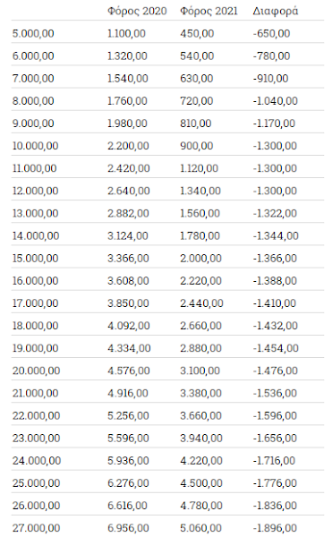 Η αλλαγή που θα αποτυπωθεί στο εκκαθαριστικό του 2021 θα αφορά στους πάντες (ακόμη και αυτούς που δηλώνουν κέρδη 5000 ευρώ) και θα είναι εντυπωσιακή όπως φαίνεται και στον ακόλουθο πίνακα: