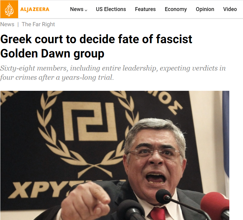 Το Al Jazeera μεταδίδει ότι «Το ελληνικό δικαστήριο θα αποφασίσει τη μοίρα της φασιστικής ομάδας Χρυσής Αυγής»