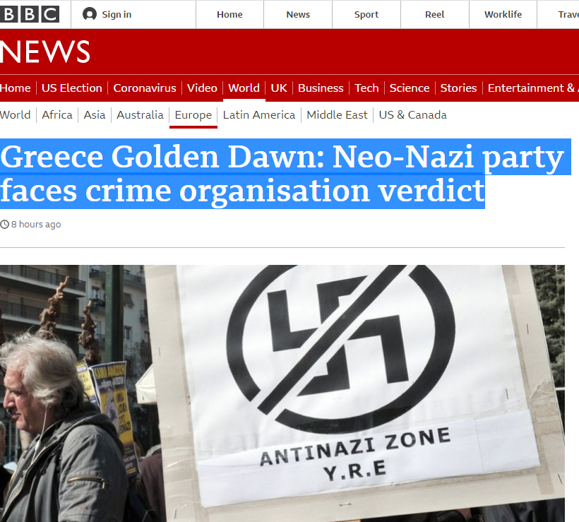 Το BBC στην ιστοσελίδα του φιλοξένησε άρθρο με τίτλο «Ελλάδα-Χρυσή Αυγή: Το νεοναζιστικό κόμμα αντιμετωπίζει την ετυμηγορία για την κατηγορία της εγκληματικής οργάνωσης».