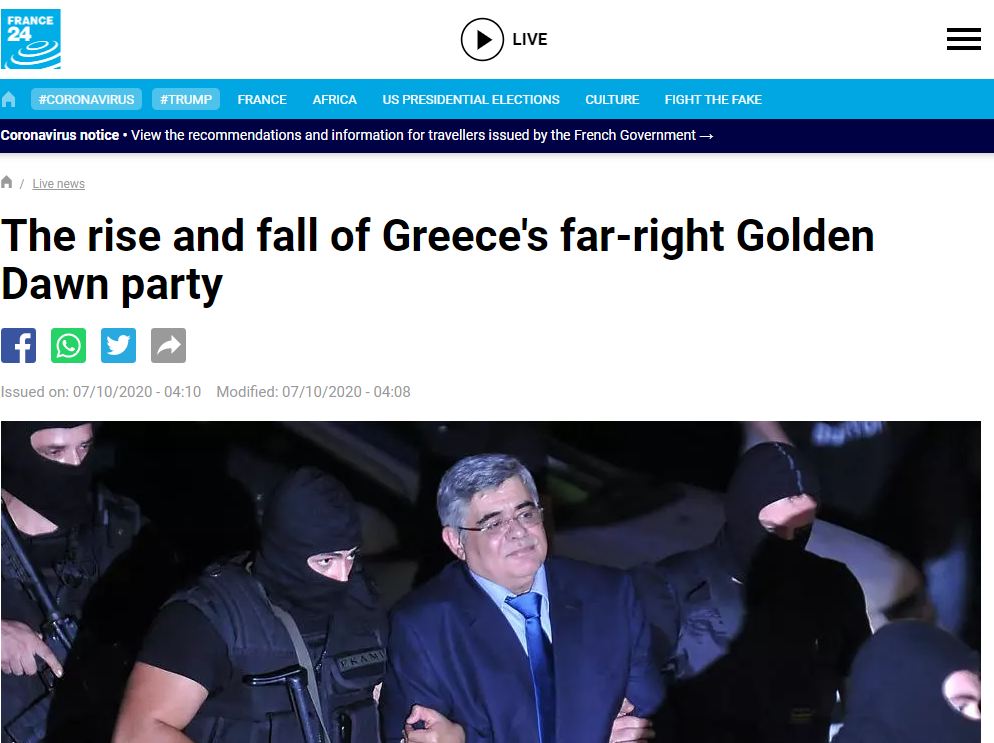 To France24 έχει τίτλο «Η άνοδος και η πτώση του ελληνικού ακροδεξιού κόμματος της Χρυσής Αυγής», με το άρθρο να παρουσιάζει τις σημαντικότερες «δράσεις» της νεοναζιστικής οργάνωσης από το 2012 έως και το 2019.