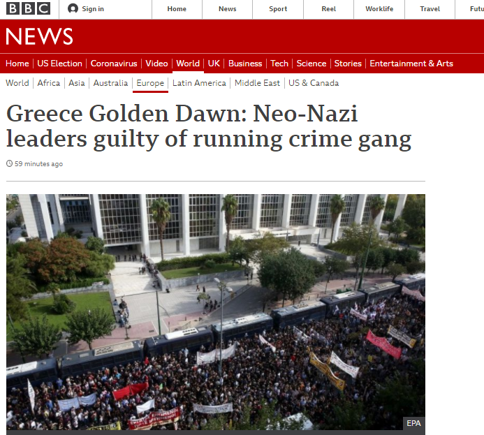 «Οι ηγέτες της ακροδεξιάς Χρυσής Αυγής, του τρίτου ισχυρότερου ελληνικού κόμματος στο ελληνικό κοινοβούλιο την περίοδο της κρίσης χρέους, κρίθηκαν ένοχοι για διεύθυνση εγκληματικής οργάνωσης από την ελληνική Δικαιοσύνη», σημειώνει το πρακτορείο Reuters