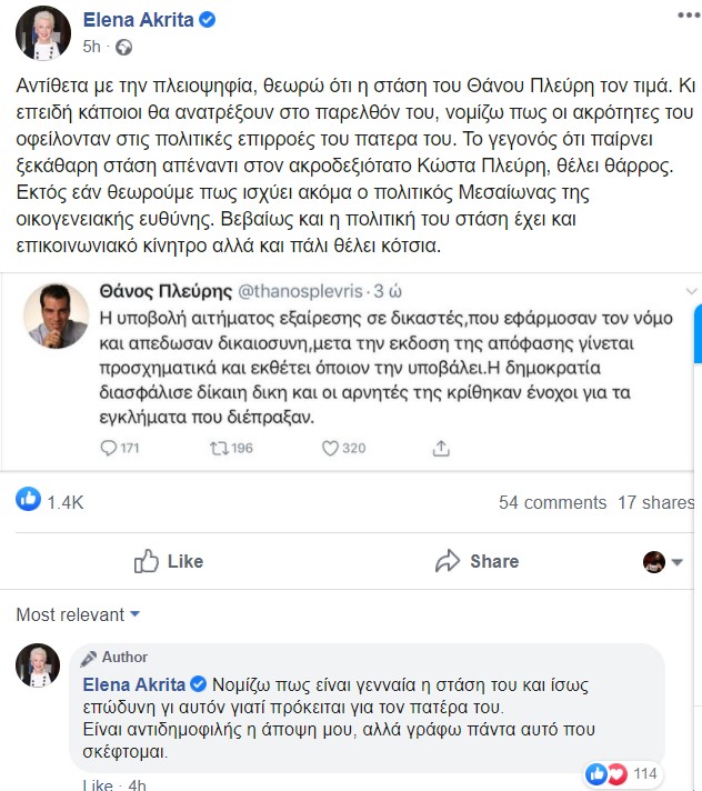 Υπέρ της στάσης που τήρησε ο βουλευτής της ΝΔ, Θάνος Πλεύρης, ο οποίος και ήλθε σε δημόσια σύγκρουση με τον πατέρα του, Κωνσταντίνο, που ως συνήγορος του χρυσαυγίτη Γιάννη Λαγού, ζήτησε την εξαίρεση των δικαστών της δίκης της Χρυσής Αυγής, τάχθηκε η Έλενα Ακρίτα με ανάρτησή της στο Facebook.