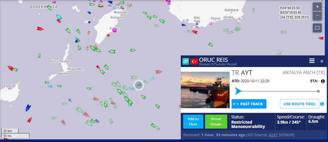 Μετά από 24 ώρες άνοιξε το σύστημα γεωγραφικού προσδιορισμού του τουρκικού ερευνητικού σκάφους Όρουτς Ρέις.