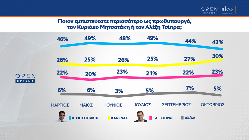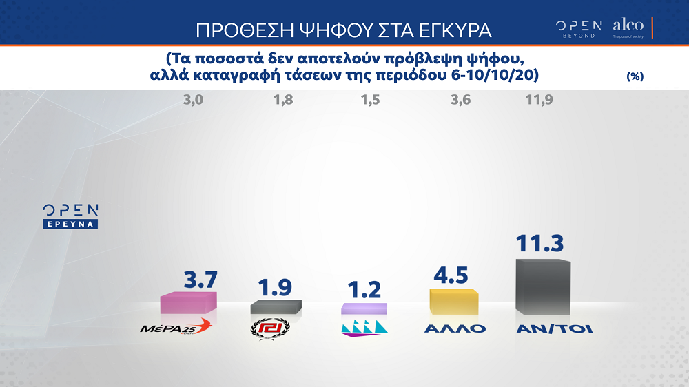 Τέλος, στην πρόθεση ψήφου το 38,3% στηρίζει ΝΔ, το 22,9% ΣΥΡΙΖΑ, το 6,7% ΚΙΝΑΛ, το 5,3% ΚΚΕ και το 4,3% Ελληνική Λύση.