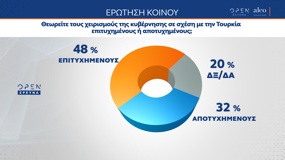 Στη συνέχεια, το 48% θεωρεί επιτυχημένους τους χειρισμούς της κυβέρνησης σε σχέση με την Τουρκία, το 32% τους θεωρεί αποτυχημένους και το 20% δεν ξέρει/δεν απαντά.