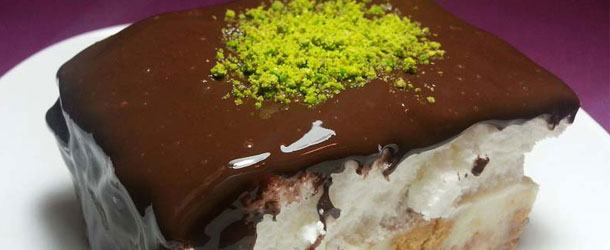 Για να στήσουμε το γλυκό, αρχικά ανακατεύουμε τη σαντιγί στην έτοιμη κρέμα (αφήνουμε λίγη σαντιγί για τη διακόσμηση), χτυπώντας την στο μίξερ για 5-7 λεπτά σε υψηλή ταχύτητα. Σπάμε τα σαβουαγιάρ σε 4 μέρη το καθένα και τα προσθέτουμε στην κρέμα, ενσωματώνοντας τα καλά, με τη βοήθεια μιας σπάτουλας. Μεταφέρουμε το μίγμα αυτό σε ένα πυρέξ και ισιώνουμε την επιφάνεια. Περιχύνουμε με την κρύα σάλτσα σοκολάτας και τοποθετούμε στο ψυγείο για τουλάχιστον 4 ώρες. Διακοσμούμε με την υπόλοιπη σαντιγί που έχουμε φυλάξει, κόβουμε σε κομμάτια και απολαμβάνουμε!