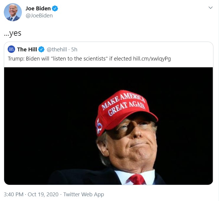 Μία λέξη με τρία γράμματα: αυτό ήταν το μόνο που χρειάστηκε ο Δημοκρατικός υποψήφιος για την προεδρία των ΗΠΑ, Τζο Μπάιντεν για να «συντρίψει» νέα παραληρηματική επίθεση που του έκανε ο Ντόναλντ Τραμπ, στην προσπάθειά του να κλείσει την ψαλίδα που τους χωρίζει.