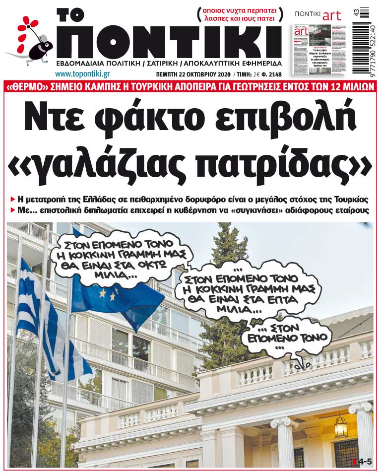 Με πρωτοσέλιδο τίτλο «Νέο φάκτο επιβολή “γαλάζιας πατρίδας”» και αναλυτικό-αποκαλυπτικό ρεπορτάζ για το «θερμό» σημείο καμπής στα ελληνοτουρκικά που είναι η τουρκική απόπειρα για γεωτρήσεις εντός των 12 μιλίων και τον στόχο της Τουρκίας να μετατρέψει την Ελλάδα σε πειθαρχημένο δορυφόρο, κυκλοφορεί το «ΠΟΝΤΙΚΙ» το πρωί της Πέμπτης.