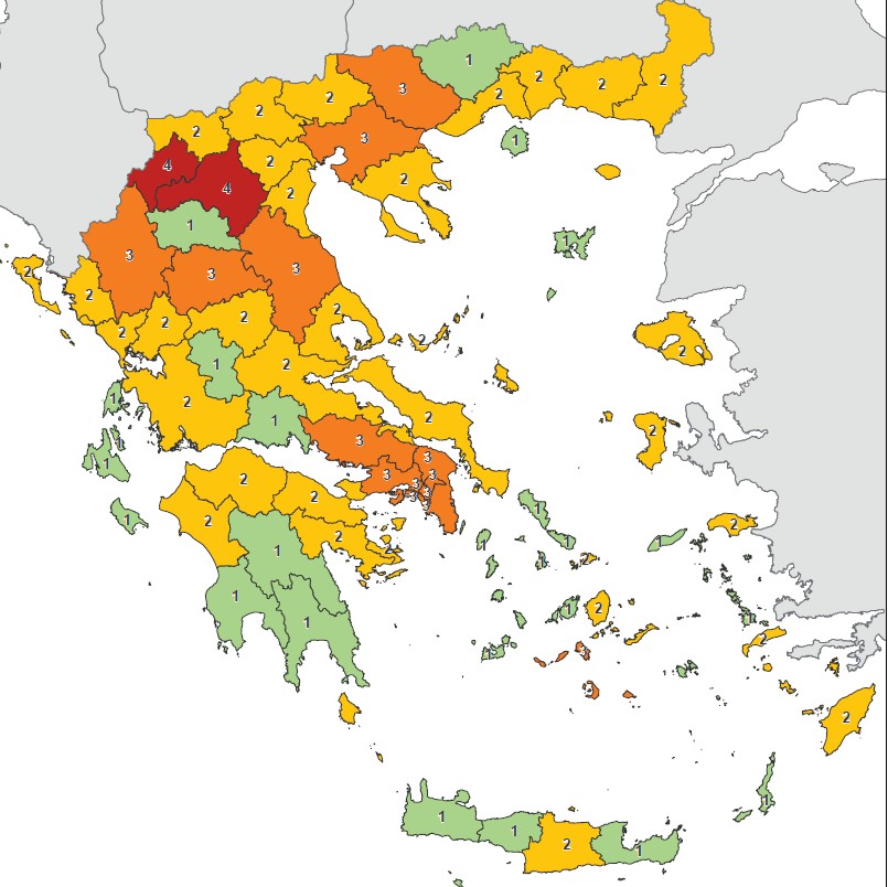 2 Περιφερειακές Ενότητες στο επίπεδο 4( Αυξημένου Κινδύνου) καμία περιοχή δεν ήταν σε αυτό το βαθμό συναγερμού πριν 14 μέρες.