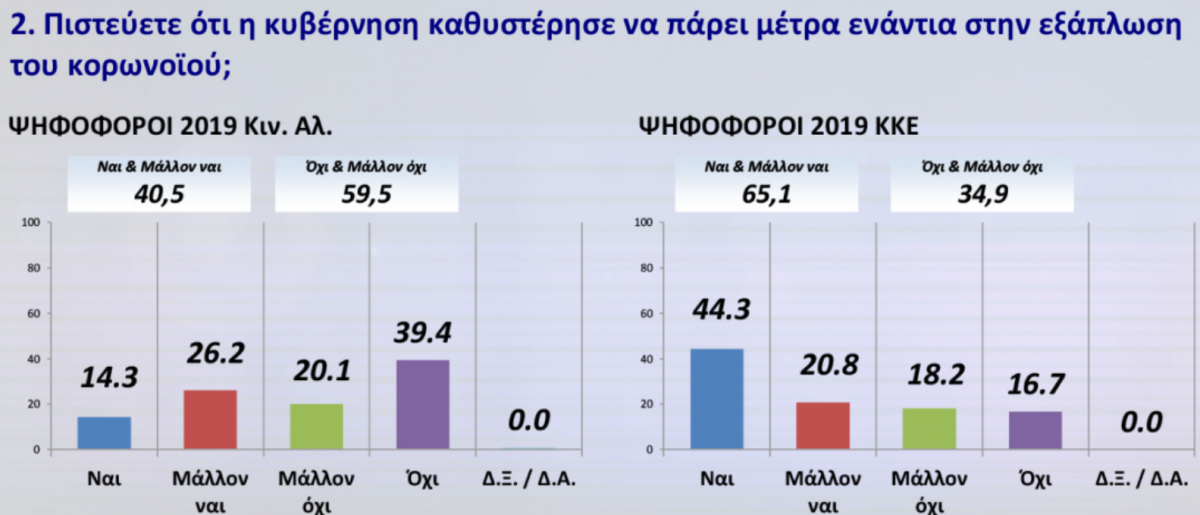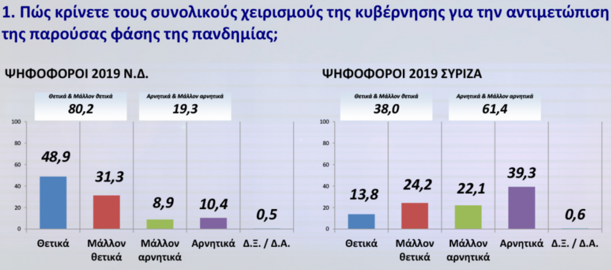 Απαραίτητα (σε ποσοστό 71,1%) αλλά όχι επαρκή για την αντιμετώπιση της πανδημίας (σε ποσοστό 62,1%) θεωρούν οι πολίτες τα μέτρα που ισχύουν σήμερα στη χώρα για τον κορωνοΐό. Κρίνουν θετικά τους συνολικούς χειρισμούς της κυβέρνησης για την πανδημία (58,3%) και θεωρούν ότι έλαβε έγκαρια τα μέτρα (52,9%). Αποδίδουν την ευθύνη για τη ραγδαία αύξηση των κρουσμάτων κυρίως στη μη τήρηση των μέτρων από μερίδα πολιτών (60,3%) και εμφανίζονται αρνητικοί (70,7%) στην προοπτική ενός γενικευμένου lockdown.