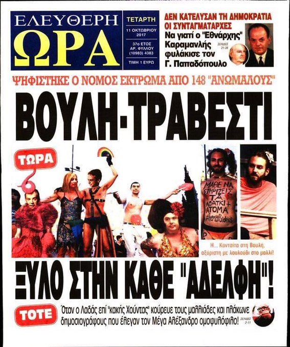Τριετής φυλάκιση με τριετή αναστολή και πρόστιμο 20.000 ευρώ επιβλήθηκε στην εφημερίδα «Ελεύθερη Ώρα» για το τρανσοφοβικό πρωτοσέλιδό της τον Οκτώβριο του 2017.