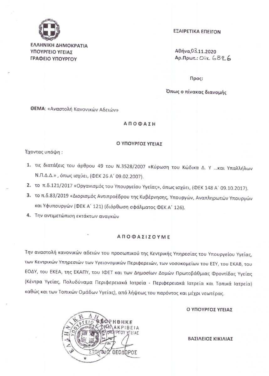 Η απόφαση αφορά την αναστολή κανονικών αδειών του προσωπικού της Κεντρικης Υπηρεσίας του υπουργειου Υγείας, των Κεντρικών Υπηρεσιών των Υγειονομικών Περιφερειών, των νοσοκομείων του ΕΣΥ, του ΕΚΑΒ, του ΕΟΔΥ, του ΕΚΕΑ, της ΕΚΑΠΥ, του ΙΦΕΤ και των Δημόσιων Δομών Πρωτοβάθμιας Φροντίδας Υγείας (Κέντρα Υγείας, Πολυδύναμα Περιφερειακά Ιατρεία – Περιφερειακά Ιατρεία και Τοπικά Ιατρεία καθώς και των Τοπικών Ομάδων Υγείας).