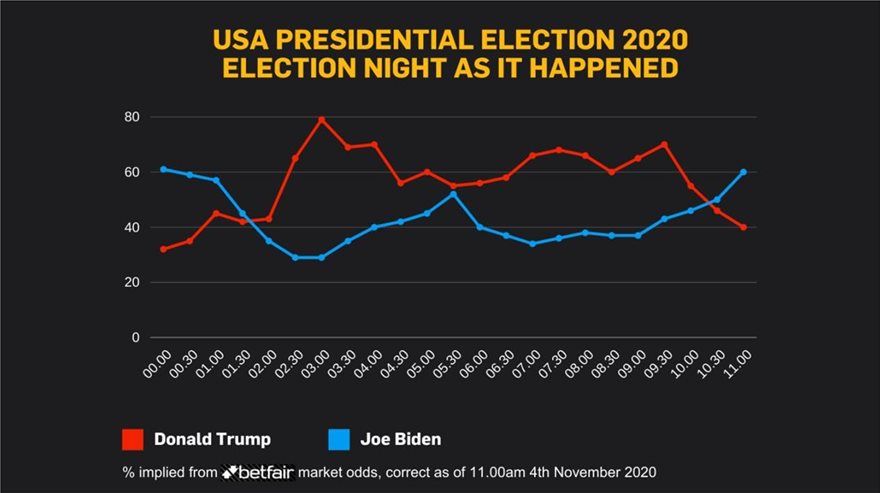 Οι πιθανότητες να κερδίσει ο Μπάιντεν είχαν μειωθεί σε λιγότερες από το ένα τρίτο κάποια στιγμή μέσα στη νύχτα, σύμφωνα με τα στοιχεία των γραφείων στοιχημάτων.
