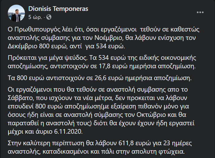 Στην αποκάλυψη ότι οι εργαζόμενοι που θα μπουν σε αναστολή το Νοέμβριο δεν πρόκειται να λάβουν 800 ευρώ, προχωράει ο εργατολογος Διονύσης Τεμπονέρας.