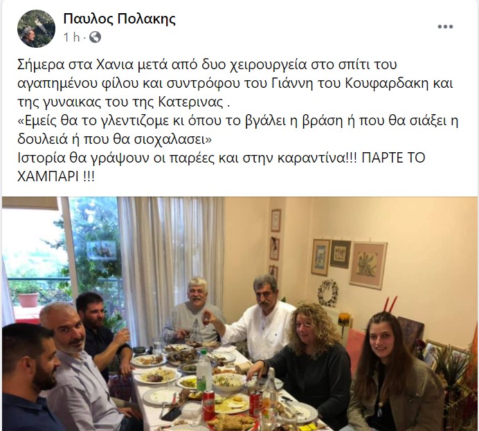 Ο Π. Πολάκης ανέβασε στο Facebook φωτογραφία από συγκέντρωση και γεύμα στο σπίτι φίλου του στα Χανιά, παρά το γεγονός ότι -ως γιατρός ο ίδιος- ξέρει ότι κάτι τέτοιο απαγορεύεται.