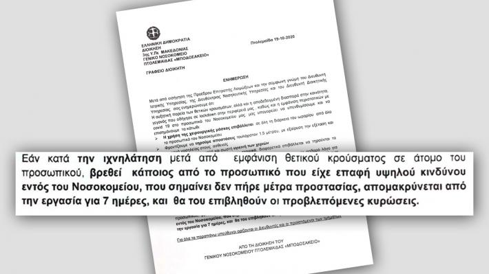 Χαρακτηριστικά, στο έγγραφο που έφερε στη δημοσιότητα ο «Ριζοσπάστης», από τη διοίκηση του Νοσοκομείου Πτολεμαΐδας «Μποδοσάκειο» προς τους εργαζόμενους (με ημερομηνία 19/10/2020), αναφέρεται: «Εάν κατά την ιχνηλάτηση μετά από εμφάνιση θετικού κρούσματος σε άτομο του προσωπικού βρεθεί κάποιος από το προσωπικό που είχε επαφή υψηλού κινδύνου εντός του νοσοκομείου, που σημαίνει δεν πήρε μέτρα προστασίας, απομακρύνεται από την εργασία για 7 ημέρες, και θα του επιβληθούν οι προβλεπόμενες κυρώσεις».