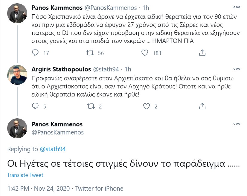 Συγκεκριμένα, ο Π. Καμμένος έγραψε: «Πόσο Χριστιανικό είναι άραγε να έρχεται ειδική θεραπεία για τον 90 ετών και πριν μια εβδομάδα να έφυγαν 27 χρόνος από τις Σέρρες και νέος πατέρας ο DJ που δεν είχαν πρόσβαση στην ειδική θεραπεία να εξηγήσουν στους γονείς και στα παιδιά των νεκρών… ΗΜΑΡΤΟΝ ΠΙΑ».