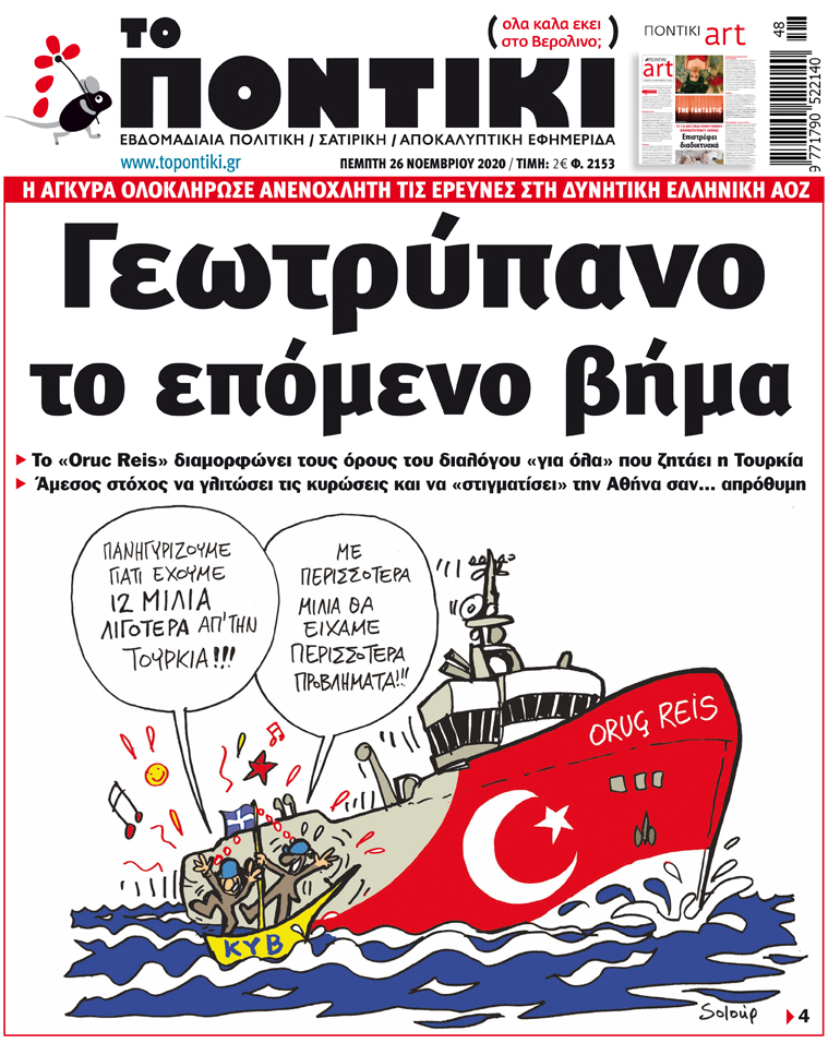 Με πρωτοσέλιδο τίτλο «Γεωτρύπανο το επόμενο βήμα» και αναλυτικό-αποκαλυπτικό ρεπορτάζ για το πώς η Τουρκία ολοκλήρωσε ανενόχλητη τις έρευνες στη δυνητική ελληνική ΑΟΖ και πώς το Oruc Reis διαμορφώνει τους όρους του διαλόγου «για όλα» που θέλει η Άγκυρα, κυκλοφορεί το «ΠΟΝΤΙΚΙ» το πρωί της Πέμπτης.