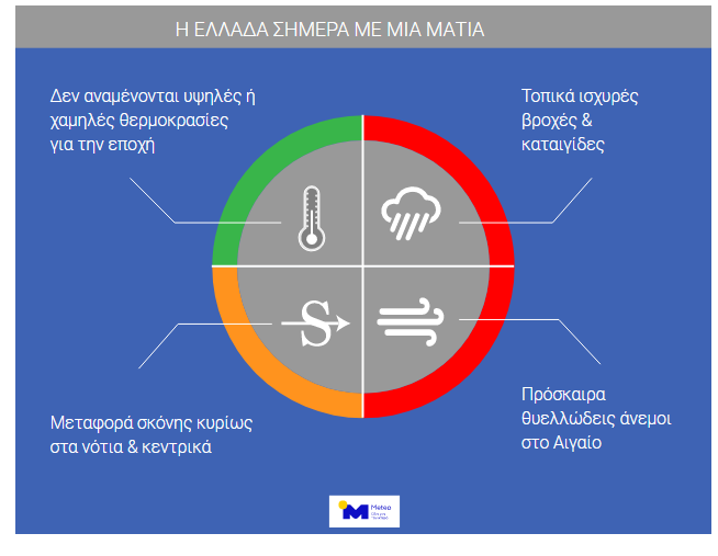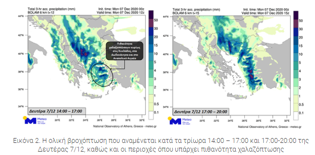 Σύμφωνα με το Εθνικό Αστεροσκοπείο, χιονοπτώσεις αναμένεται να σημειωθούν στα ορεινά της Ηπείρου, της Μακεδονίας και της Θράκης, ενώ πιθανότητα χαλαζοπτώσεων υπάρχει έως το μεσημέρι κυρίως στις Κυκλάδες, στα Δωδεκάνησα και στα νησιά του Ανατολικού Αιγαίου.