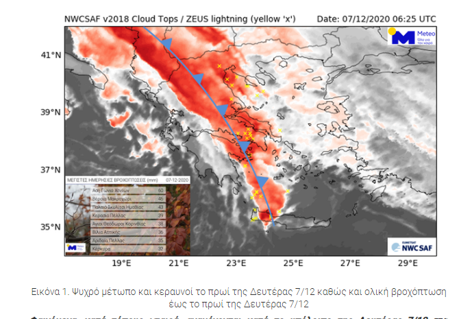 Στην παρακάτω εικόνα φαίνεται το ψυχρό μέτωπο, όπως το είδε ο μετεωρολογικός δορυφόρος METEOSAT, το πρωί της Δευτέρας, οι κεραυνοί που κατέγραψε την ίδια στιγμή το σύστημα “ΖΕΥΣ” του Εθνικού Αστεροσκοπείου Αθηνών καθώς και τα μεγαλύτερα ύψη βροχής που καταγράφηκαν από το δίκτυο αυτόματων μετεωρολογικών σταθμών του Εθνικού Αστεροσκοπείου Αθηνών / Meteo.gr.