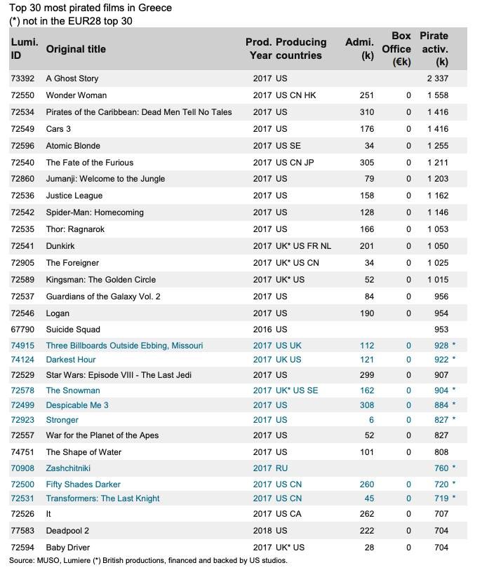 Για εκείνο, λοιπόν, το διάστημα, το Justice League ήταν η πιο πειρατικά κατεβασμένη ταινία στην Ευρώπη με 42 εκατ. Downloads, η τηλεοπτική σειρά The Walking Dead πήρε την πρωτιά στην κατηγορία της με 435 εκατ. downloads και ο Ed Sheeran “ζημιώθηκε” περισσότερο από κάθε άλλο μουσικό με 7.5 εκατ. downloads.