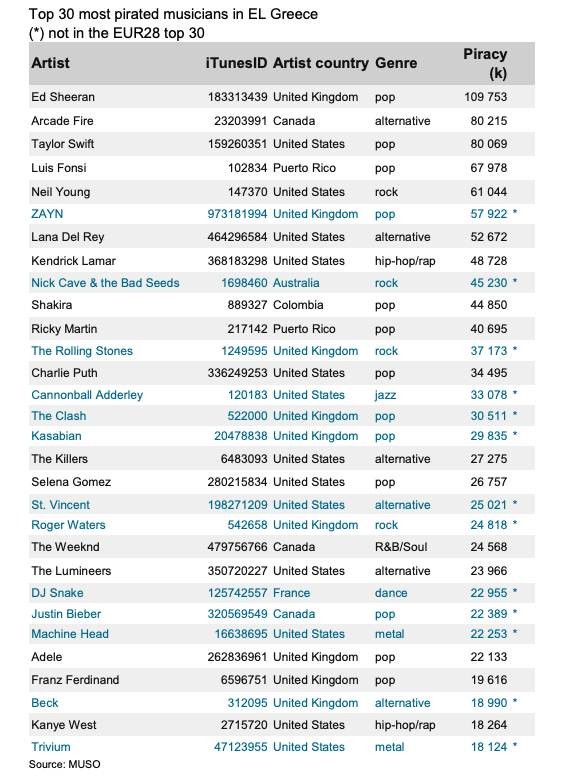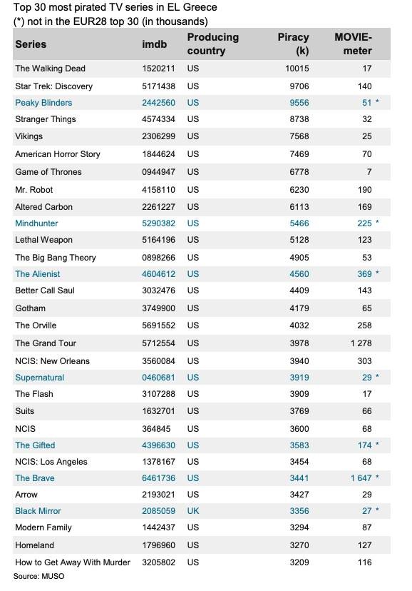 Η αρμόδια υπηρεσία προστασίας πνευματικών δικαιωμάτων της Ευρωπαϊκής Ένωσης (EUIPO – EU Intellectual Property Office) δημοσίευσε μια εκτενή ανάλυση της για τις ταινίες, τις τηλεοπτικές σειρές και τους μουσικούς που επλήγησαν περισσότερο από τα πειρατικά downloads σε κάθε χώρα ξεχωριστά.