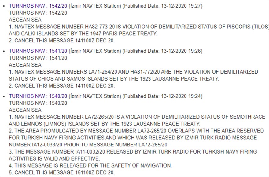 Όπως αναφέρεται στις Navtex, παραβιάζονται τόσο η Συνθήκη της Λωζάννης, την οποία, πάντως, ο Tούρκος πρόεδρος έχει ζητήσει την αναθεώρησή της, όσο και τη Συνθήκη των Παρισίων.