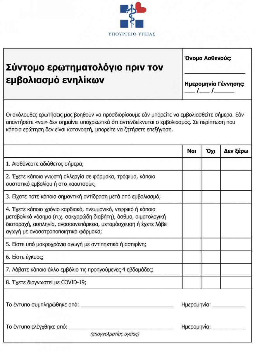 Αφού συμπληρώσει το ονοματεπώνυμό του και την ημερομηνία, ενδεικτικά, με «Ναι», «Όχι» ή «Δεν ξέρω» θα πρέπει να απαντήσει σε ερωτήσεις όπως, «αισθάνεστε αδιάθετος σήμερα;», «Έχετε κάποια γνωστή αλλεργία σε φάρμακα, τρόφιμα, κάποιο συστατικό εμβολίου ή στο καουτσούκ;» ή «Είστε υπό μακροχρόνια αγωγή με αντιπηκτικά ή ασπιρίνη;» και «Έχετε διαγνωστεί με COVID-19;».