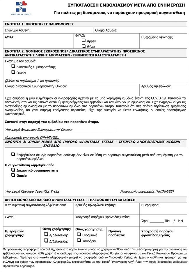 Ουσιαστικά πρόκειται για δύο έντυπα: το ερωτηματολόγιο το οποίο θα συμπληρώνει κάθε πολίτης πριν του χορηγηθεί το εμβόλιο αλλά και ένα έντυπο συναίνεσης «μετά από ενημέρωση για ενήλικες μη δυνάμενους να παράσχουν προφορική συγκατάθεση».
