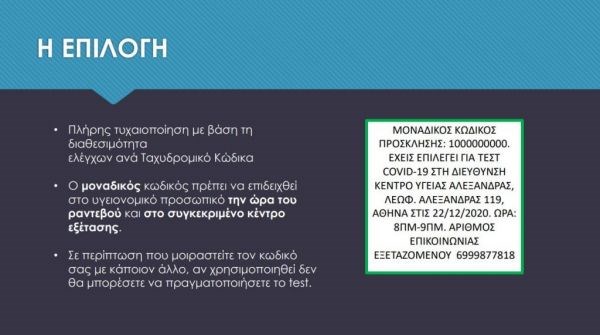 - προκειμένου να ενημερωθείτε μέσω γραπτού επιβεβαιωτικού μηνύματος κινητής τηλεφωνίας (sms) ότι έχετε επιλεγεί για τη διενέργεια δωρεάν ελέγχου ανίχνευσης κορωνοϊού, με τη λήψη μοναδικού κωδικού