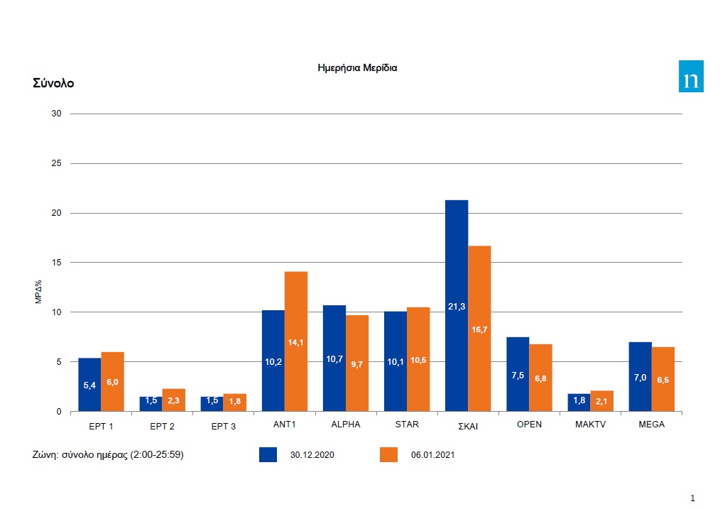 Σύμφωνα με τις μετρήσεις της Nielsen για την Τετάρτη 6 Ιανουαρίου, πρώτος στον πίνακα της τηλεθέασης ήταν ο ΣΚΑΪ με 16,7%, δεύτερος ο ΑΝΤ1 με 14,1%, τρίτο το Star με 10,5% και τέταρτος ο Alpha με 9,7%.