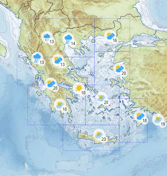 Η θερμοκρασία θα κυμανθεί από 7 έως 17 βαθμούς στη Βόρεια Ελλάδα, 11 έως 23 βαθμούς στην Κεντρική και Νότια Ελλάδα, 13 έως 20 βαθμούς στη Δυτική Ελλάδα, 15 έως 21 βαθμούς στις Κυκλάδες και έως τους 24 βαθμούς στην Κρήτη (στη Βόρεια Κρήτη έως τους 28 βαθμούς), 16 έως 20 βαθμούς στα νησιά του Ανατολικού Αιγαίου και στα Δωδεκάνησα.
