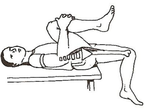 Τοποθέτηση : Ξαπλώστε στην άκρη του κρεβατιού έτσι ώστε το πόδι να βρίσκεται στον αέρα (εικόνα) και κρατήστε το αντίθετο πόδι από το γόνατο έτσι ώστε να νιώθετε την διάταση.