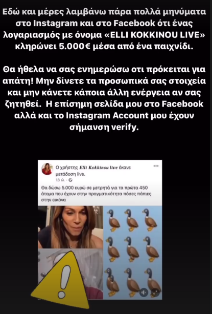 «Εδώ και μέρες λαμβάνω πάρα πολλά μηνύματα στο Instagram και στο Facebook ότι ένας λογαριασμός με όνομα «ELLI KOKKINOU LIVE» κληρώνει 5.000€ μέσα από ένα παιχνίδι.